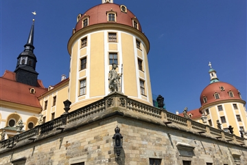 zámku Moritzburg, který se zrcadlí v hladině okolních vod jen pár kilometrů severně od Drážďan. Původně lovecký zámeček nechal August II. Silný přestavět na monumentální rezidenci, která měla sloužit jako dějiště velkolepých dvorských honů a hostin. Zámek je unikátní svou symetrií a čtyřmi masivními věžemi. Uvnitř najdeme ohromující sbírku jeleního paroží, fascinující „Ptačí síň“ s tapetami z tisíců ptačích per.