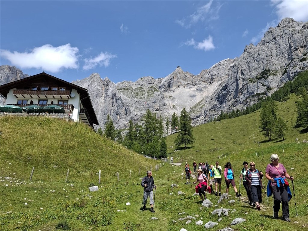 Na chatě opět zasloužené občerstvení a hlavně fotky pro ty, co zůstali doma, že my jsme vrchol Dachsteinwarte ve výšce 2741 skutečně dali! Po návratu k autobusu se opět rozdělujeme na ty, kterým už to dnes stačilo a druhou skupinu, která ještě nemá dost a chce si užít sestup do Raumsau pěšky. Cesta není nijak náročná a je zpestřená několika chatami. Zajímá nás především Austriahütte. Ve spodní části této chaty se totiž ukrývá sice malinké, ale velice zajímavé muzeum horolezectví zaměřené přímo na tuto oblast a samozřejmě na Dachstein. Od místní paní se dovídáme velmi poutavou historii objevování a osidlování těchto hor a také historii pokoření Dachsteinu. Ten máme přímo před oknem a dokonce můžeme dalekohledem zkontrolovat, jak se daří horolezcům, kteří se snaží aktuálně dosáhnout vrcholu po jeho severní stěně. Trochu posmutníme, když paní vzpomíná, kam ještě před pár desítkami let dosahoval ledovec, po kterém jsme dnes nahoře šli. No jo, tání ledovců my ale tady a teď nezastavíme, takže opět pokračujeme v našem sestupu příjemným cestičkami klikatícími se až k hlavní cestě, kde už nás čeká autobus a zbytek výpravy. Dnešní večeře bude obzvláště zasloužená!