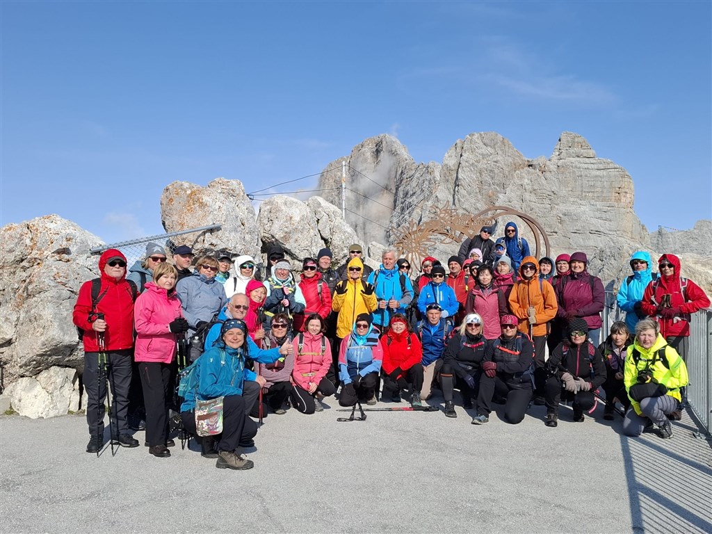Čtvrtý den nás čeká vrchol celého zájezdu, a to jak symbolicky, tak doslova. Tahák pro celé okolí Schladmingu. Ano, dnes míříme k nejvyšší hoře této části Alp – Hoher Dachstein, který jsme včera sledovali z uctivé vzdálenosti. Včera jsme si s ním na dálku poměřili své síly a dnes v plné zbroji (v dobrém oblečení i obuvi) jsme časně z rána vyrazili, abychom se vyhnuli davům na lanovku. Což se vyplatilo a ve dvou skupinách vyjíždíme nahoru do sedla Hunerkogel 2687 m n.m. Někteří odvážlivci si zpestří výjezd tím, že nejedou v kabince, ale mohou prudké stoupání výšky a klesání teploty zažít v přímém přenosu na vlastní kůži na střeše gondoly. Je to zážitek jen pro otrlé, ale kdo se nebojí, užije si jízdu jako asi žádnou jinou lanovkou.
