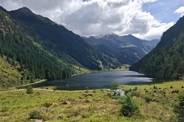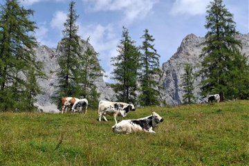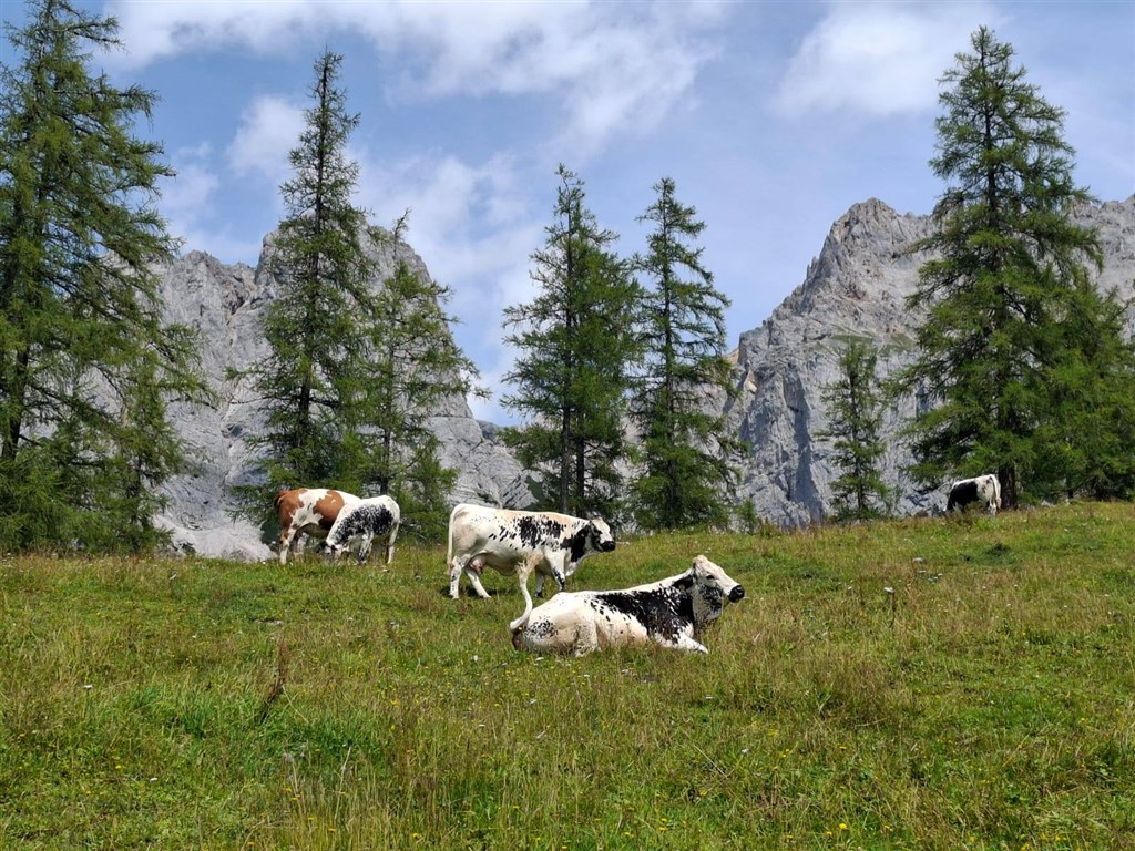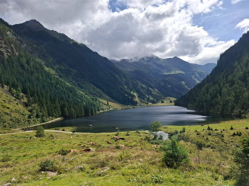 Přestávky na vydýchání prokládáme focením a koukáním na skotačící proudy vody rozbíjející se dole o skaliska na tisíce drobných kapiček. Občas máme štěstí, když lom světla vykouzlí v oparu padající a tříštící se vody barevnou duhu. Díky důmyslným stezkám máme možnost říčku Riesachbach vidět hned z pravého, hned z levého břehu a na několika místech přecházíme i vysoko nad ní. Neskutečný zážitek! Odměnou za výstup není jen úchvatný pohled na malebné jezero Riesachsee, ale mnozí z nás svůj výkon zapijí či zají nějakou tou dobrotou v chatě Gföller Alm u jezera. Někteří se jdou ještě projít kolem jezera, nebo jen ulehnou do trávy a odpočívají, kde jim společnost dělá jen cinkání zvonců alpských krav (kupodivu ne fialových).